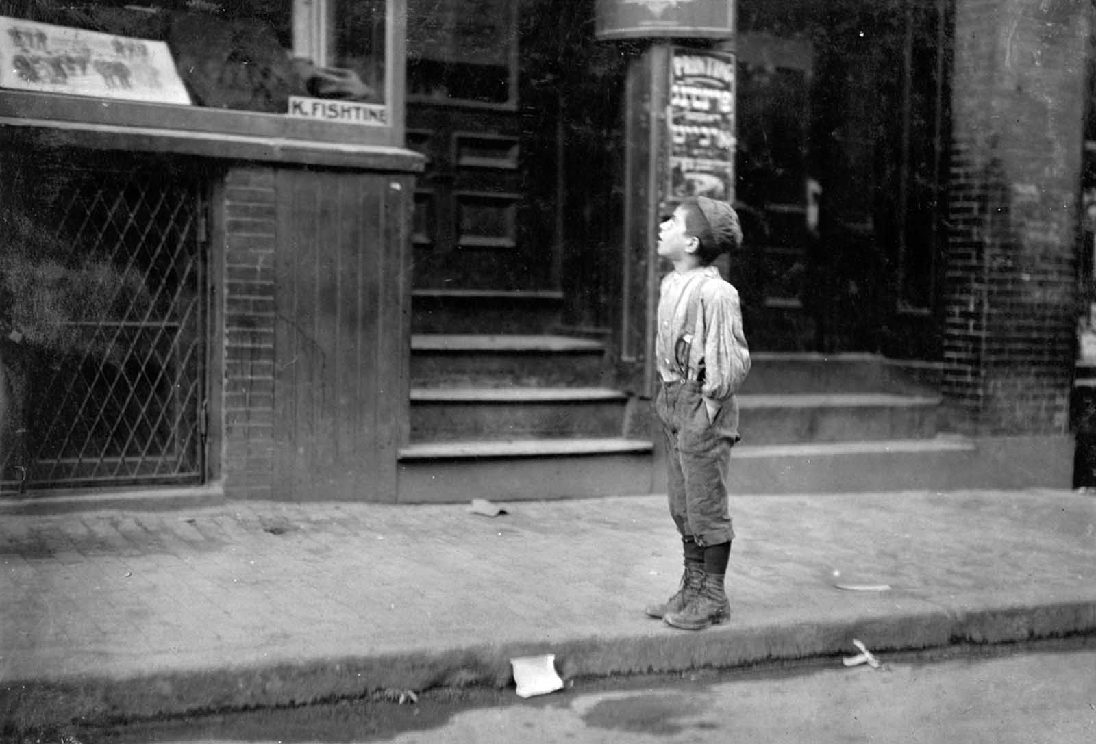 “Fire! Fire! I want to make the fire!” An Italian boy on Salem Street on Saturday morning, offering to make fires for Jewish People on their Sabbath, in Boston, Massachusetts, in October of 1909.