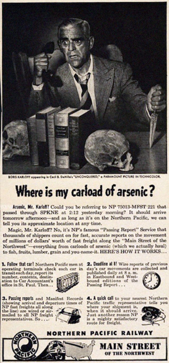 By 1947, Boris Karloff had parlayed his monster-movie reputation (“Frankenstein” in 1931, “The Mummy” in 1932) into this weird “Time” magazine ad for the Northern Pacific Railway Company.