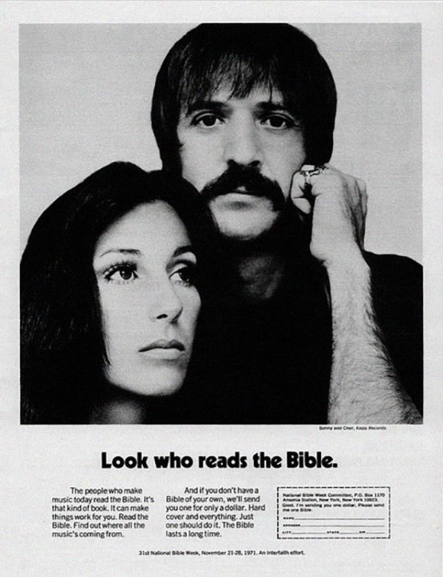 And then there’s Cher, serenely reading a Bible in a 1971 ad meant to make scripture look “groovy.” Some collaborations simply defy logic.