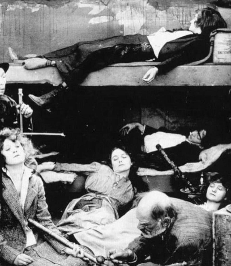 Users reclined on bunk beds, positioning elongated pipes over flickering oil lamps that heated the opium until it transformed into inhalable vapor.