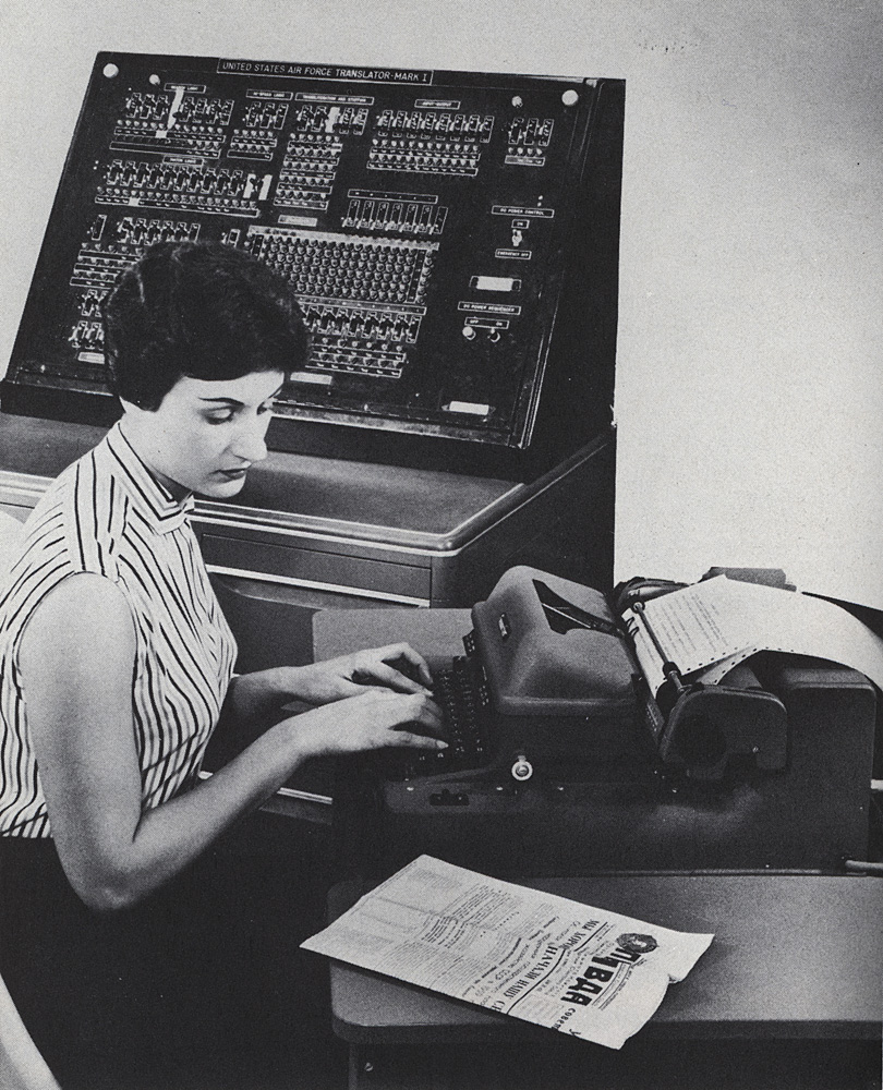 A typist feeds stories from the Russian newspaper Pravda into a special device that converts Cyrillic letters into punched tape.