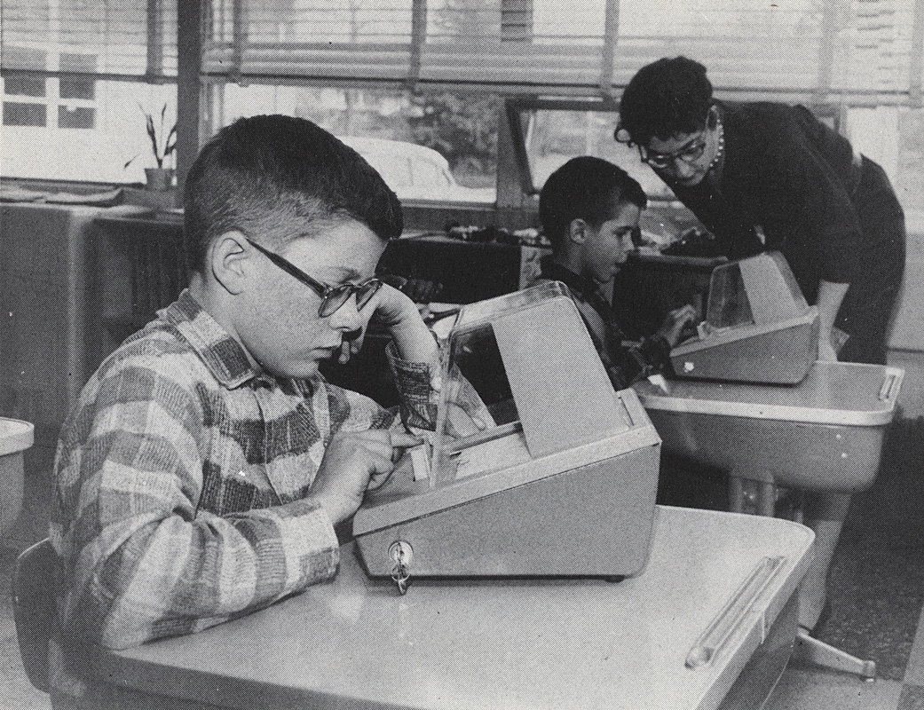In this classroom, lessons in spelling, geography, and history are displayed on a stack of cards at the top of the device.