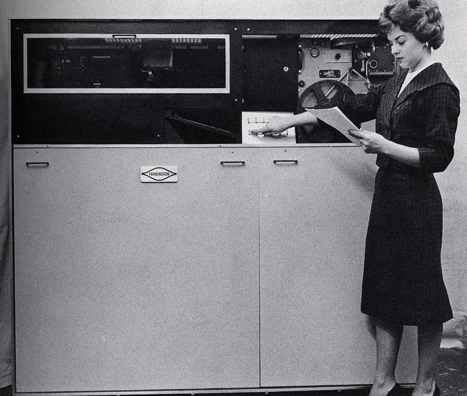 Documents placed in this device are converted into punched tape at a rate of 240 characters per second. The punched tape can then be read by another unit to reproduce the text captured by the machine.