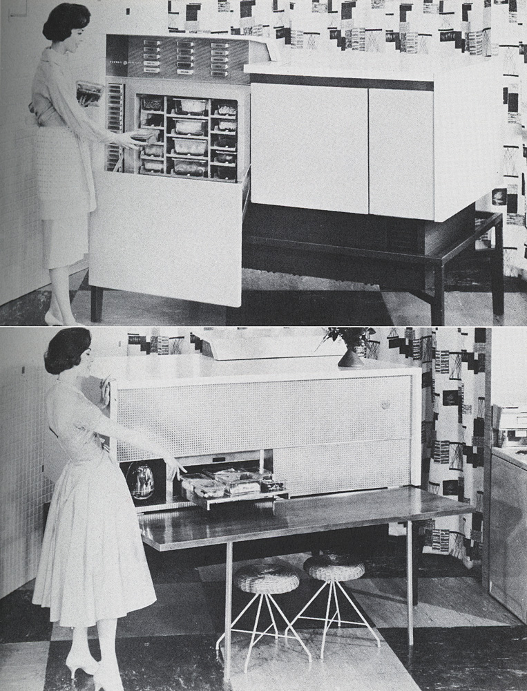 One of tomorrow’s time-savers, this combination freezer and electronic oven allows meals to be prepared in advance and stored in labeled freezer compartments.