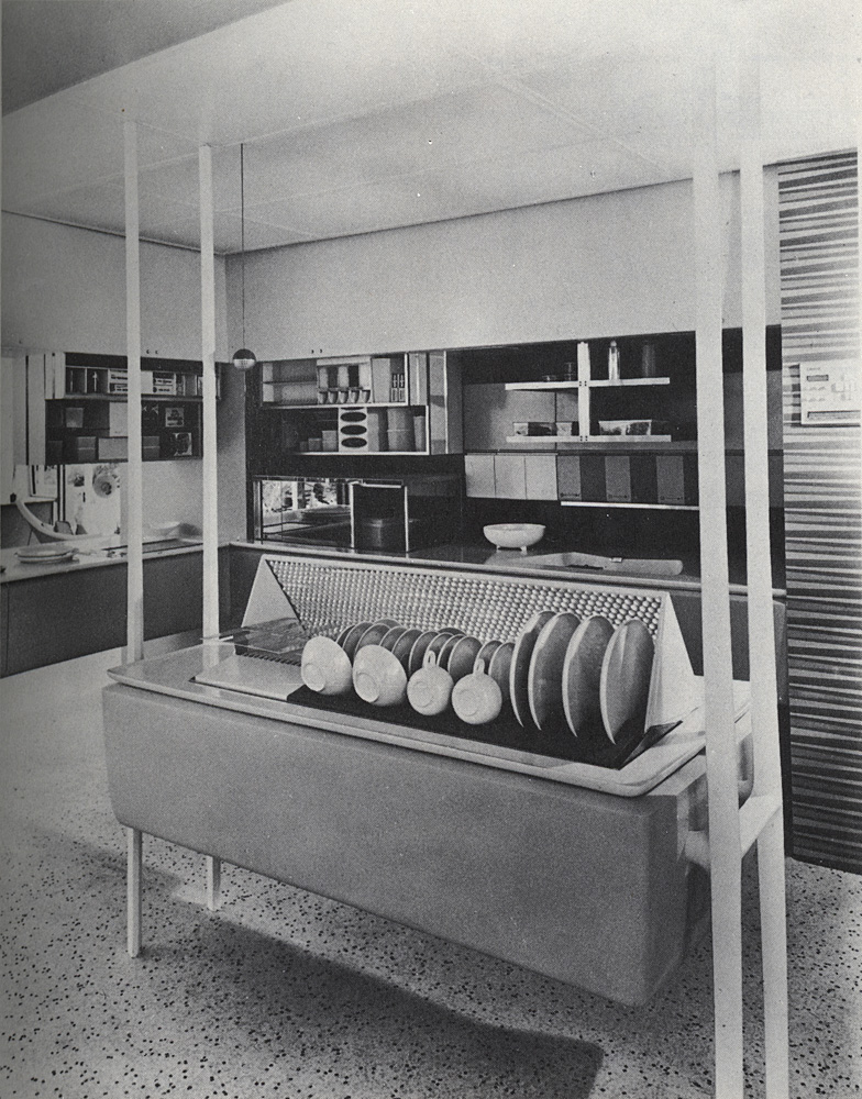 Special cabinets store foods preserved by atomic radiation. Designed by Kelvinator, this kitchen reflects the type of modern living many manufacturers envision for the 1970s.