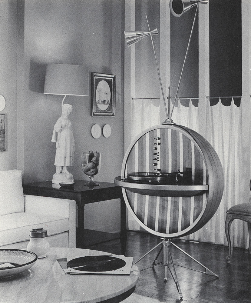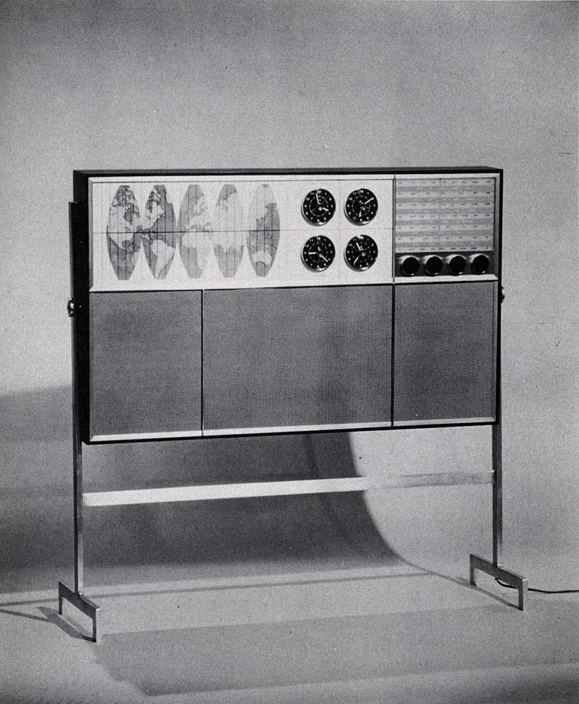 A light on the world map indicates the broadcast’s origin, while dials show the time in four major time zones. The unit, only three inches thick, also includes a stereophonic radio on the back.