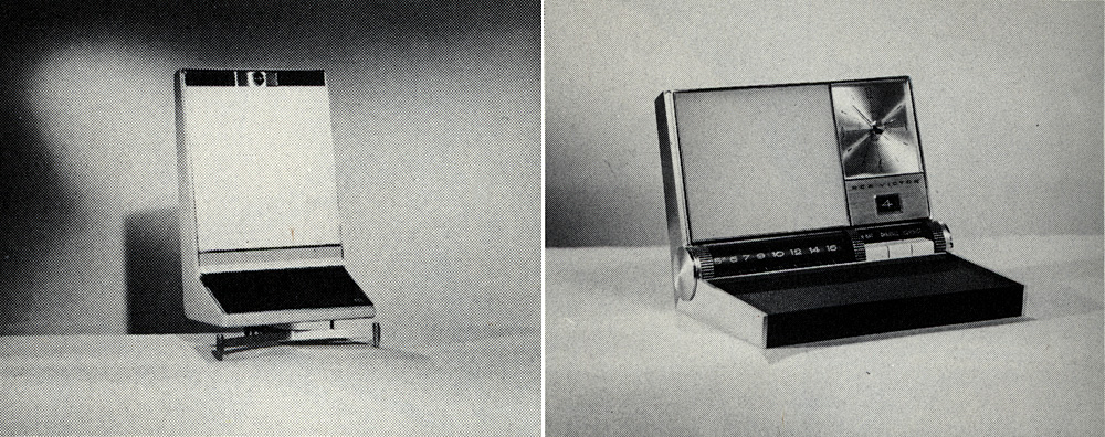 On the right, a salesman’s portable video-audio player, stored in an attaché case, can display visual presentations and function as a dictation machine.