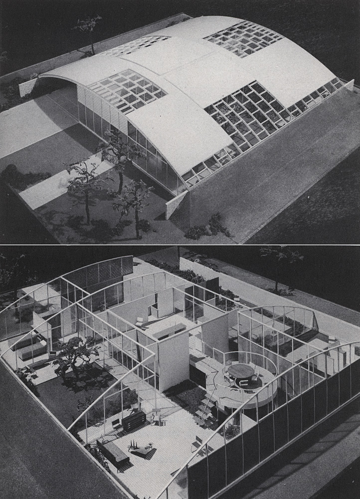 This affordable home for compact urban lots uses lightweight steel arches to span both living and outdoor recreation areas. With the roof removed, the model shows a practical interior layout.