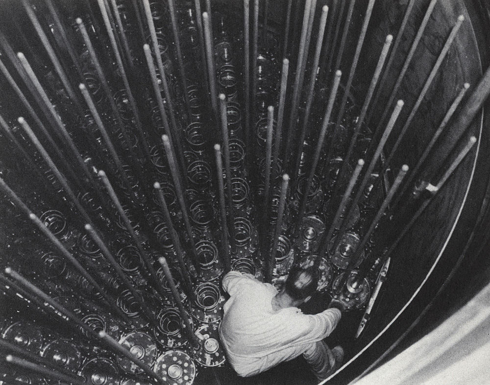 In this experimental sodium reactor, graphite contained within 119 canisters controls the neutrons necessary for atomic fission. Fuel elements are placed within coiled springs inside the tank.
