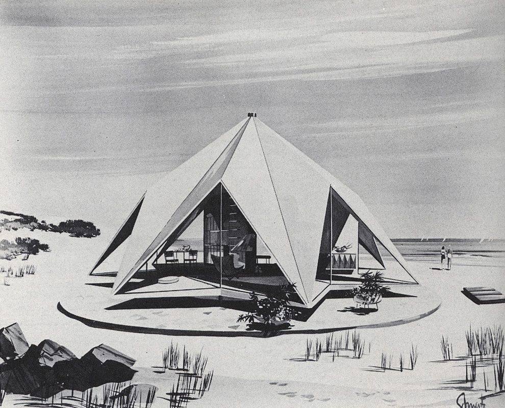 Designers envision new ways for families to enjoy leisure time in the future. This beach house features a colorful aluminum roof and glass walls that open fully to the outdoors.