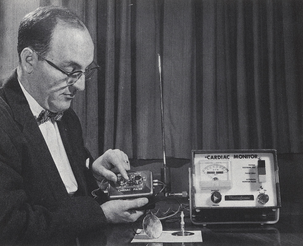 The “Cardiac Pacer” automatically stimulates the heart during trouble, while the “Cardiac Monitor” tracks the heartbeat, triggers the pacer, and sounds an alarm while sending a signal to the doctor’s receiver up to two and a half miles away.
