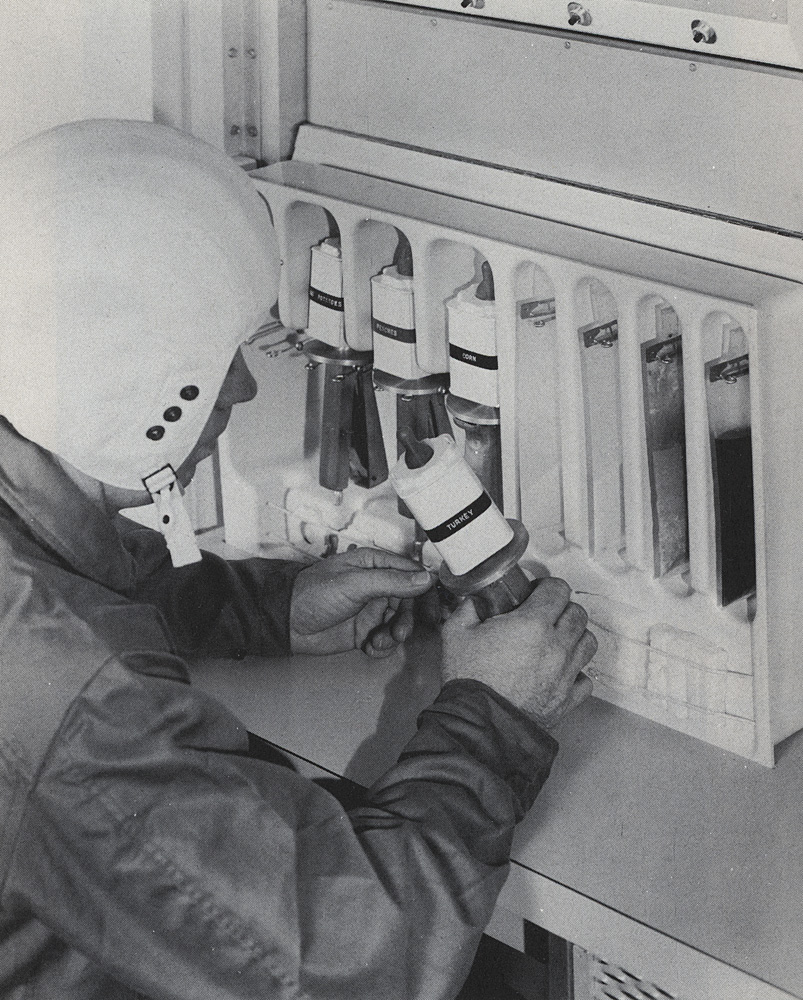 A squeeze device attaches to a punctured can, allowing food to be pushed through a nozzle directly to the diner. Research on this system continues at the Aeromedical Laboratory at Wright-Patterson Air Force Base.
