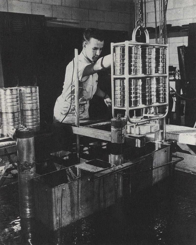 Canned beans are lowered into a radioactive chamber, where six to twenty minutes of exposure provides indefinite preservation.