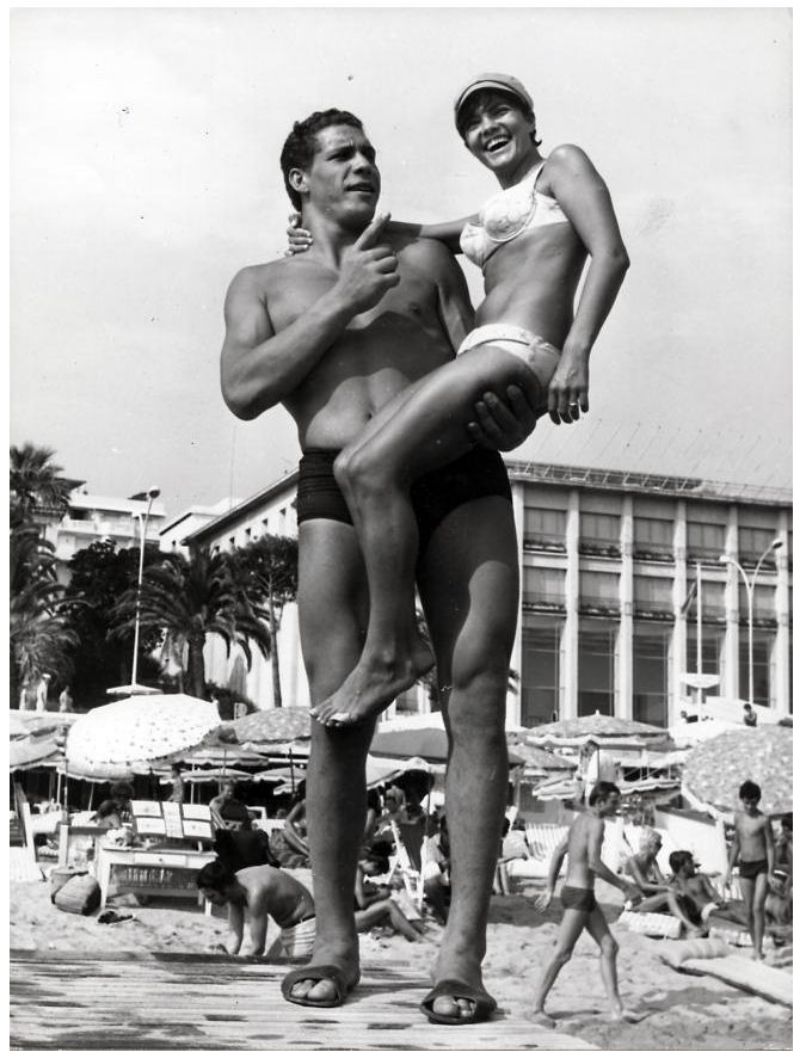 André on the ‘Croisette’, the beach boulevard in Cannes, France with a young lady in bikini, 29 July 1967.