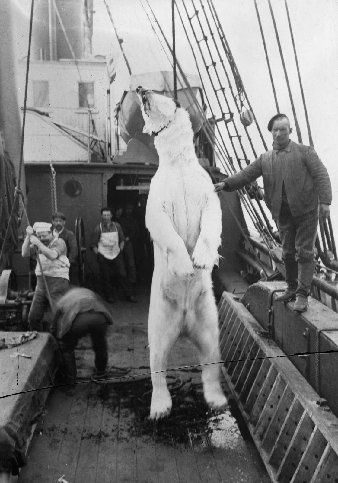 Loading a polar bear carcass on to Neptune, Hudson Bay, Nunavut, July 20, 1904.