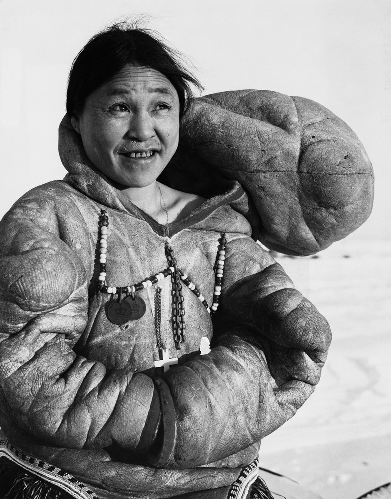 Eskimo woman wears the tall, floppy hood of her tribe. Eskimos are more properly referred to as Inuits. The term Eskimo is considered derogatory.