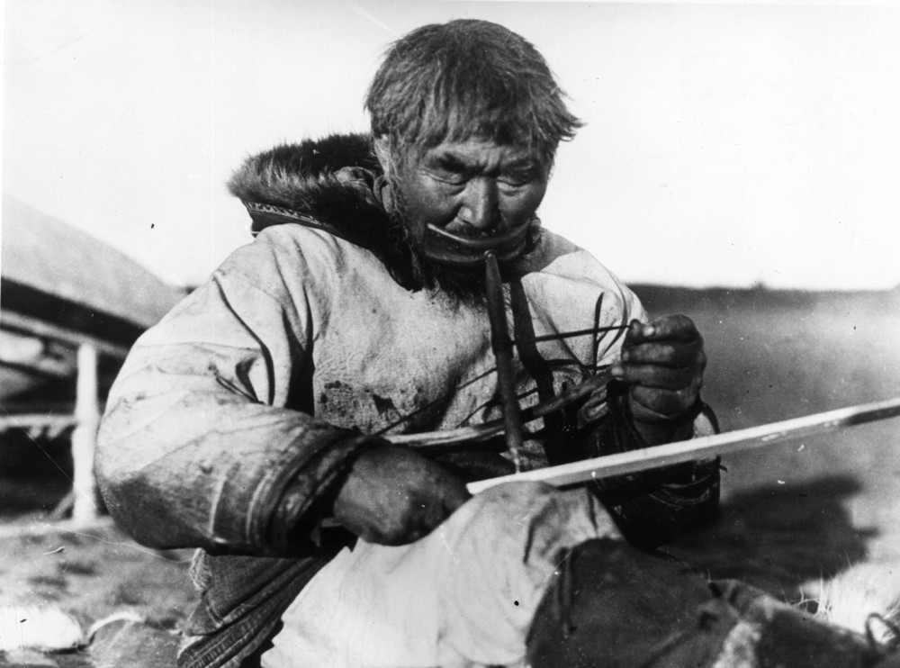 An Inuit carpenter at work using a traditional bow drill which he holds with his mouth and turns with a string, circa 1910.