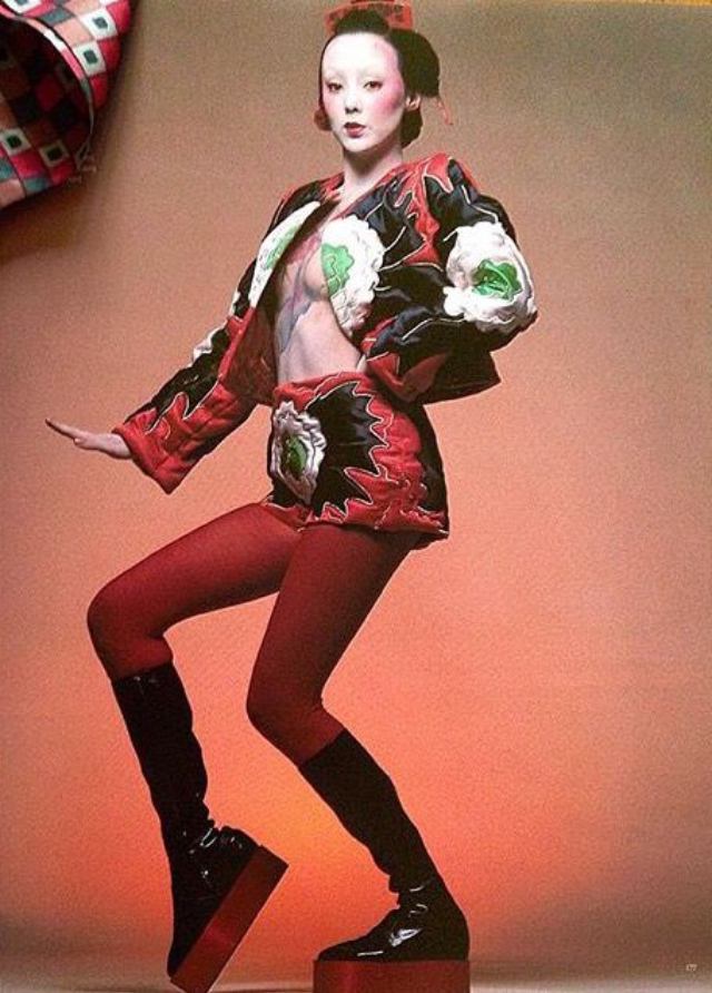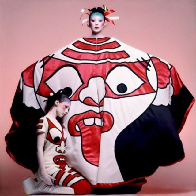 His strongest looks carry a Pop Art and glam rock energy, drawing from traditional Japanese art, particularly the imagery of Kabuki theater as filtered through ukiyo-e woodblock prints.