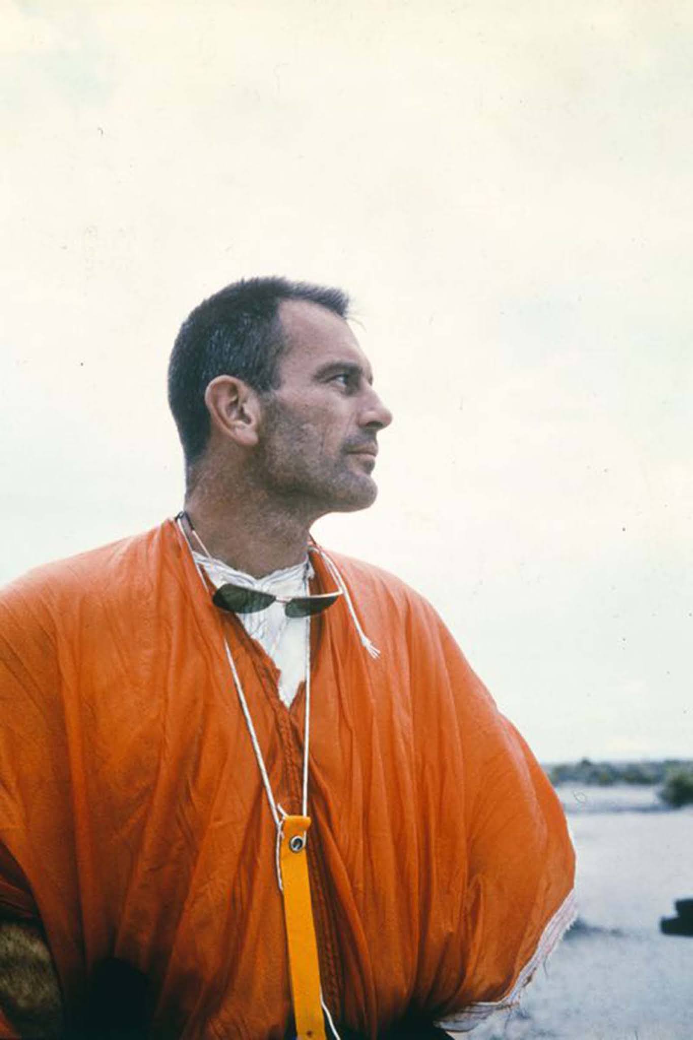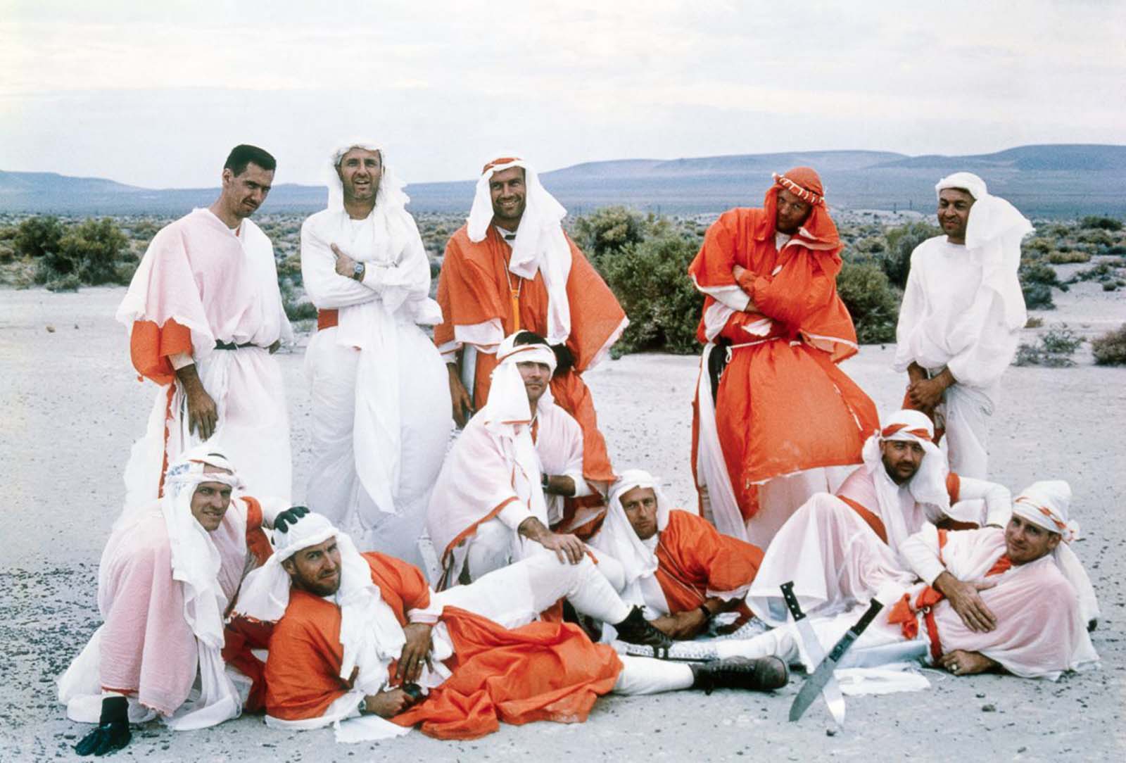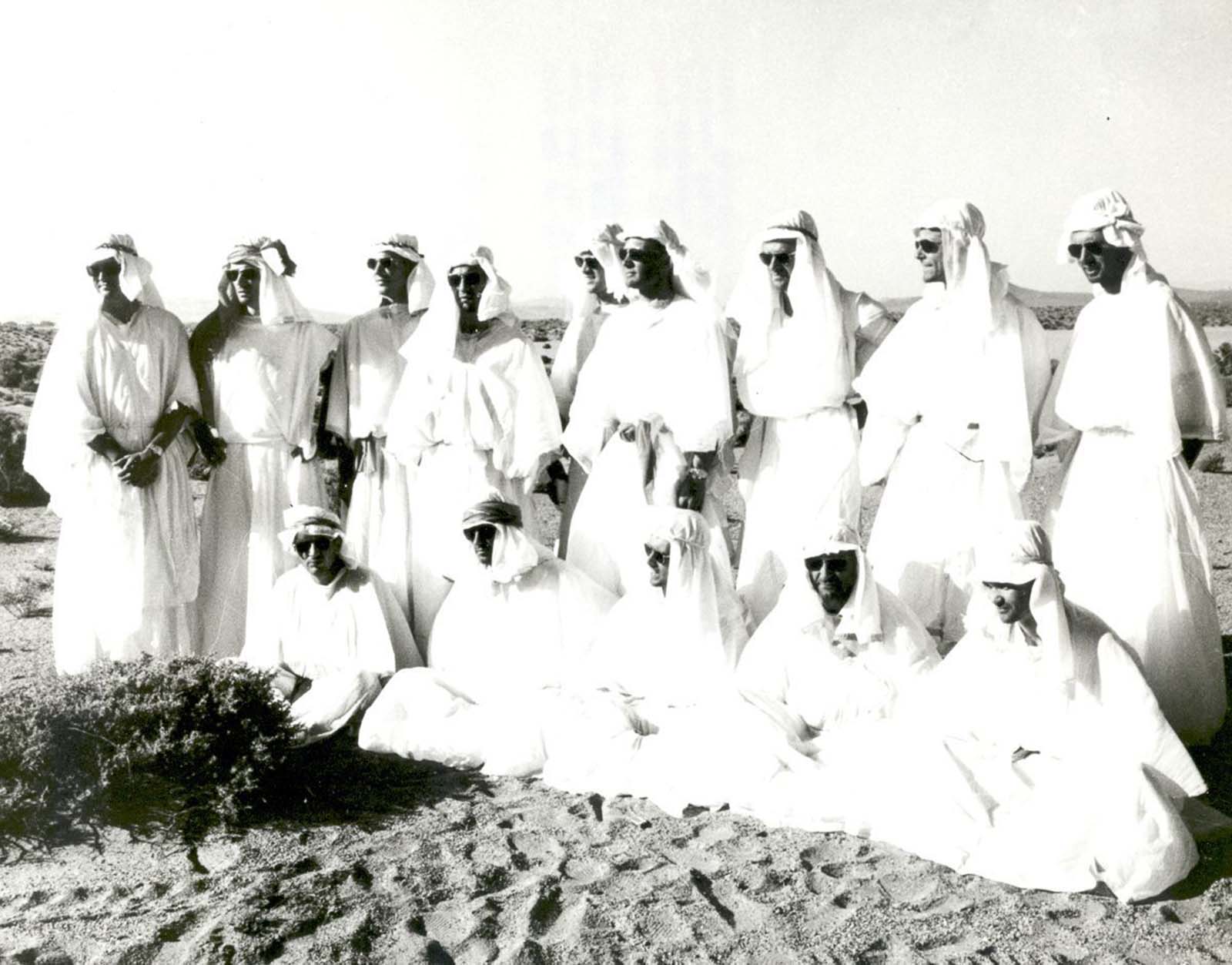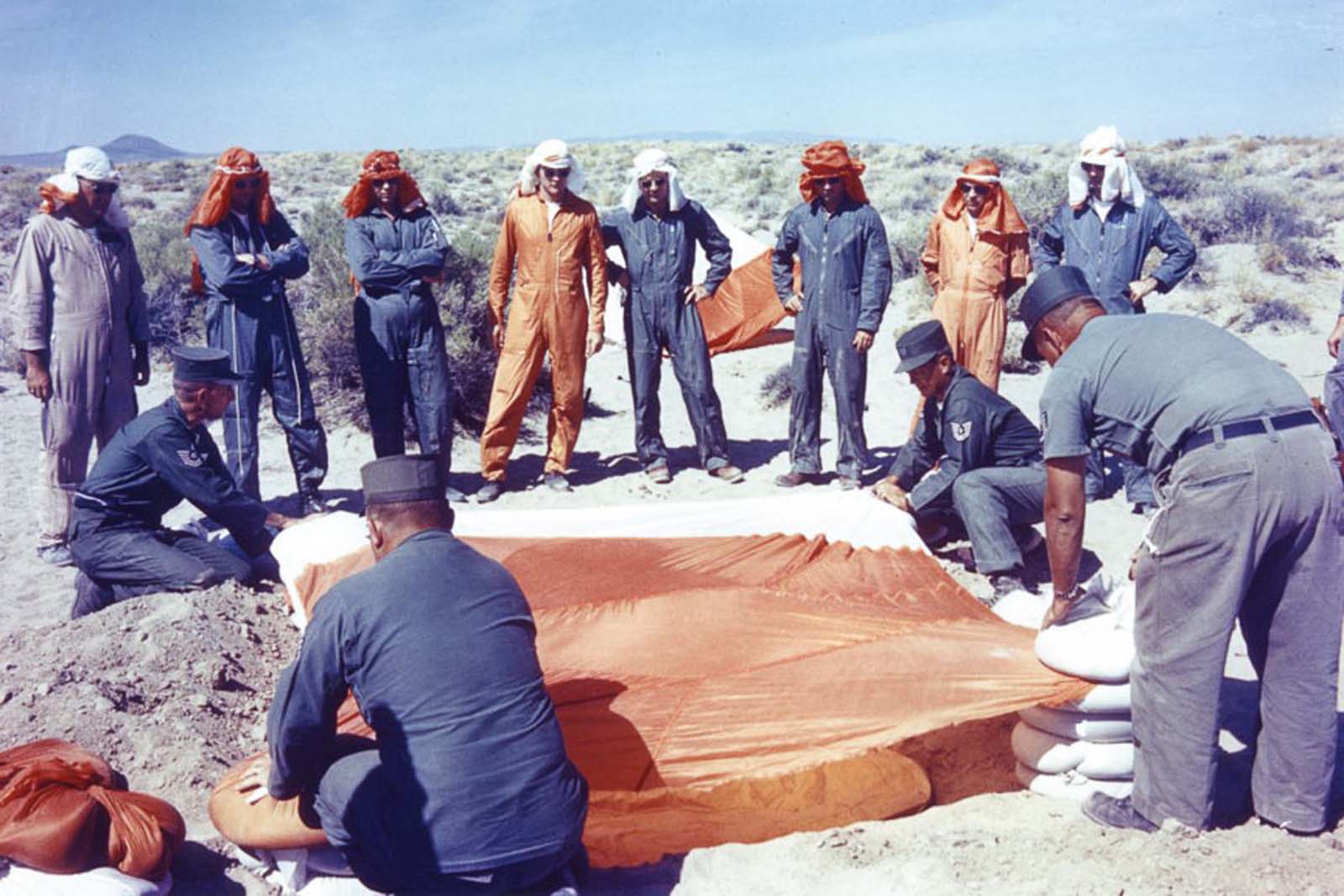 The original “Mercury Seven” astronauts, L. Gordon Cooper, M. Scott Carpenter, John Glenn, Alan Shepard, Virgil I. Grissom, Walter Schirra and Donald K. Slayton wear clothing fashioned from parachutes during desert survival training at Stead Air Force Base in Nevada. 1960.