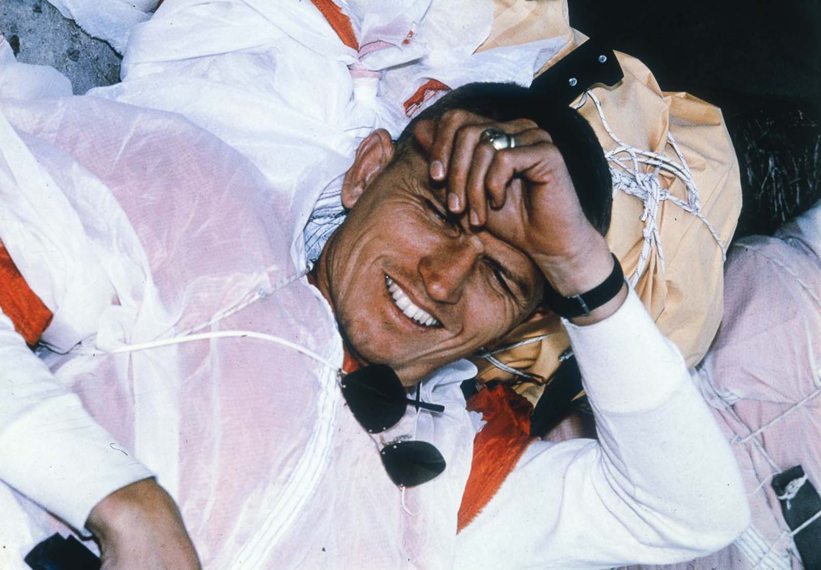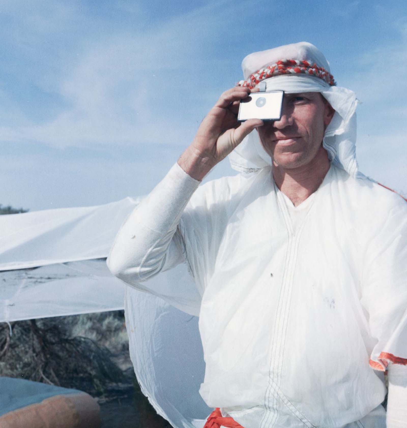 Alfred M. Worden uses a mirror to flash signals for search aircraft. 1967.