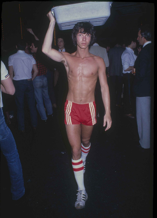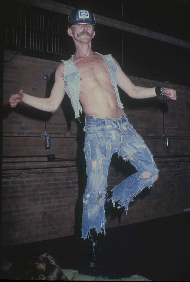 A man in tattered denim dances at New York’s Studio 54, March 1979.
