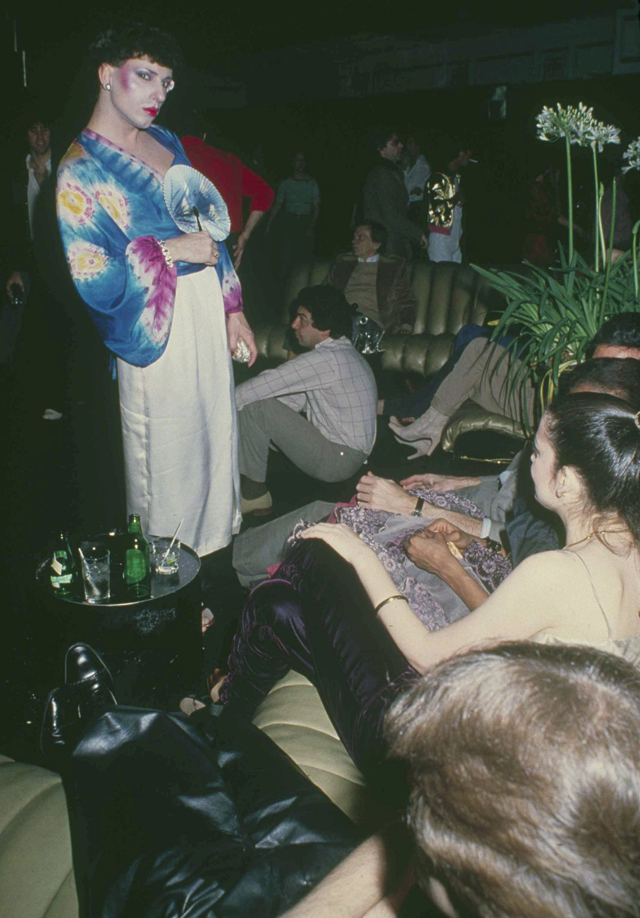 Brightly attired patron uses a fan to cool off in the lounge at New York’s Studio 54, March 1979.