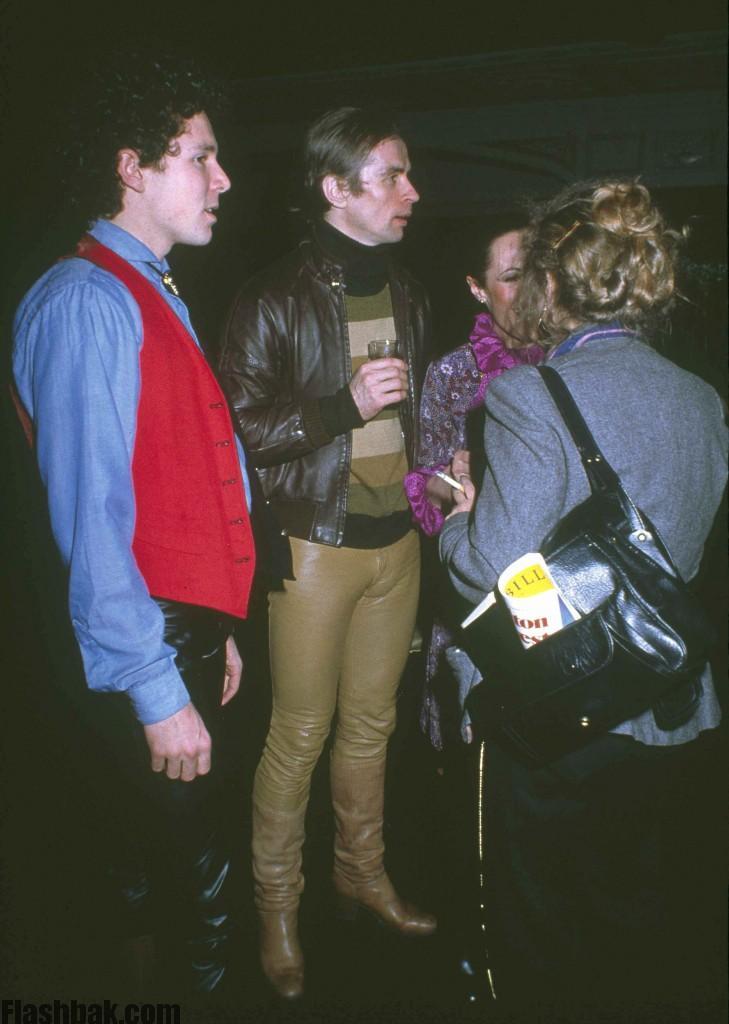 Ballet star Rudolph Nureyev, center in brown leather pants, chats with unidentified friends at New York’s Studio 54, March 1979.