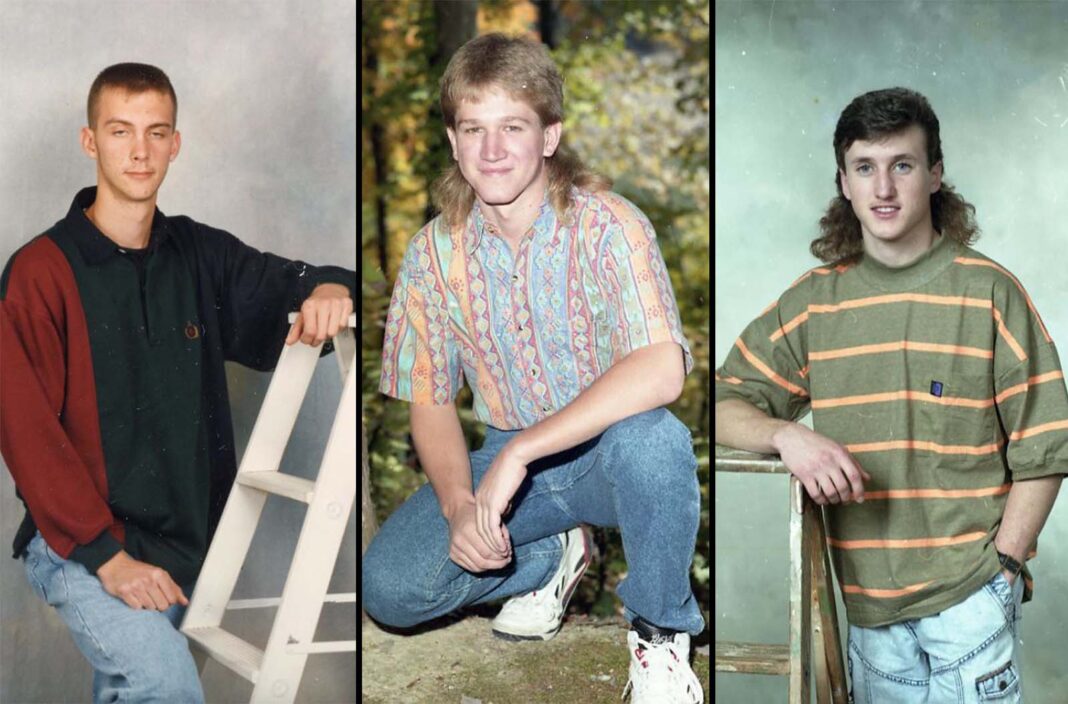 Hair is where these portraits become almost instantly dateable. The center-part curtain cut, swept loosely to each side and falling just above the brow, was the dominant style for teenage boys and young men alike.