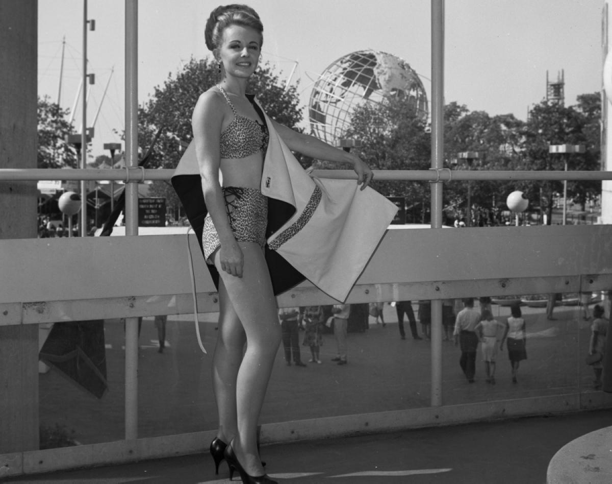 A woman models a cheetah print bikini with laced-up sides at the New York State Pavilion of the World’s Fair, where tanners of upstate Fulton County threw an all-leather fashion show in 1965. Bill Meurer/New York Daily News