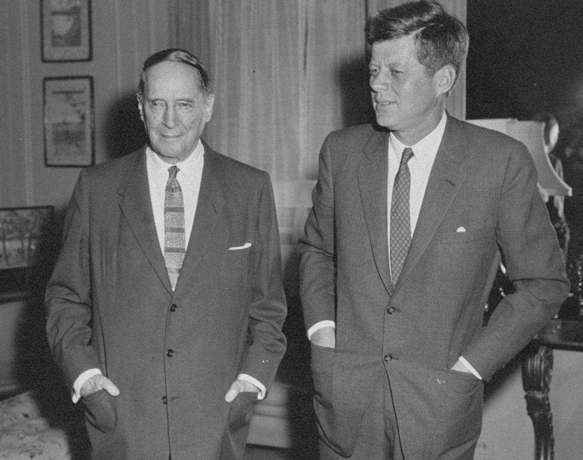 President John F. Kennedy sports a single breasted suit and a skinny tie in 1960 alongside Gen. Douglas MacArthur. Dan Farrell/New York Daily News