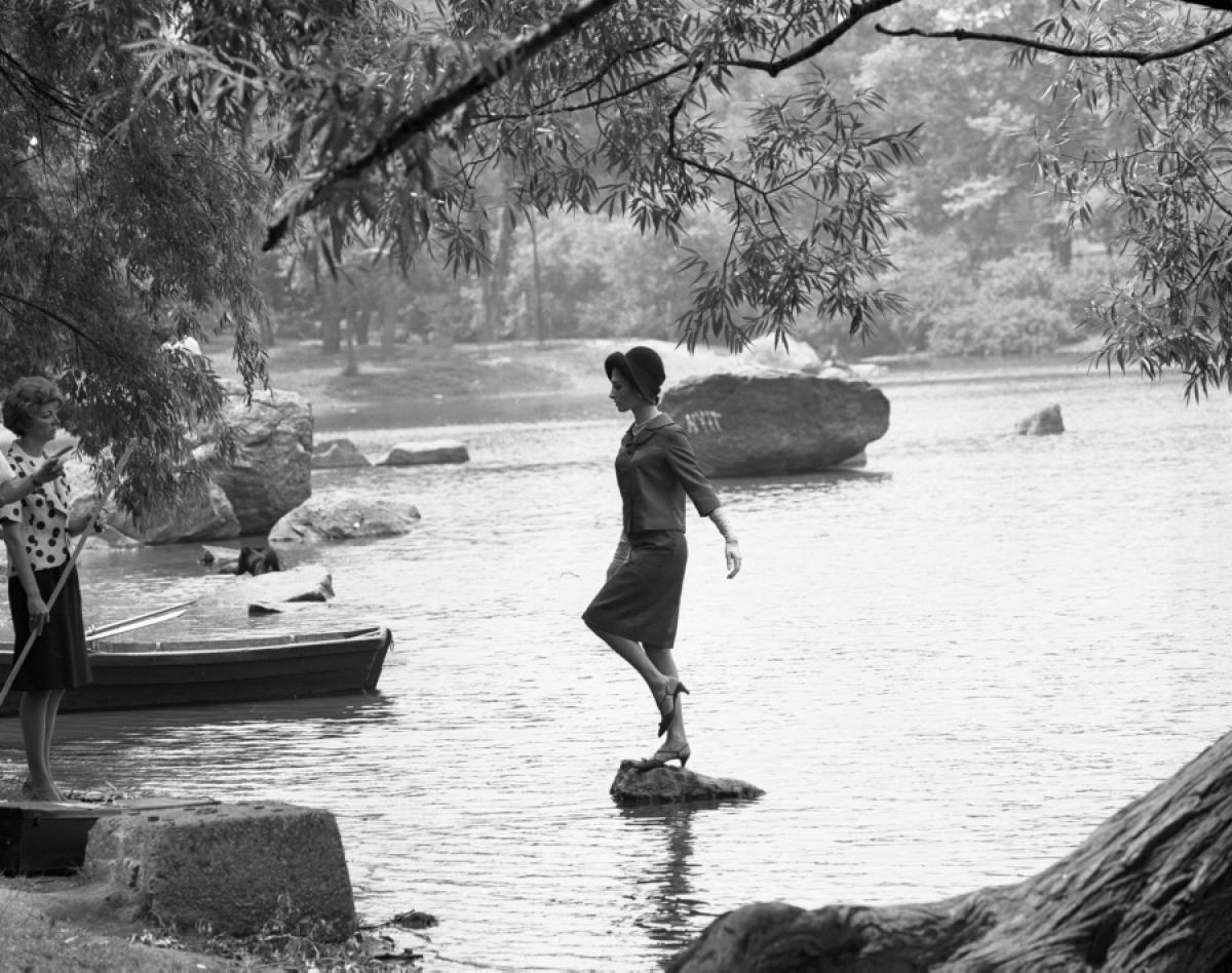 A fashion model poses on a rock in Central Park on the first day of summer in 1965. John Duprey/New York Daily News