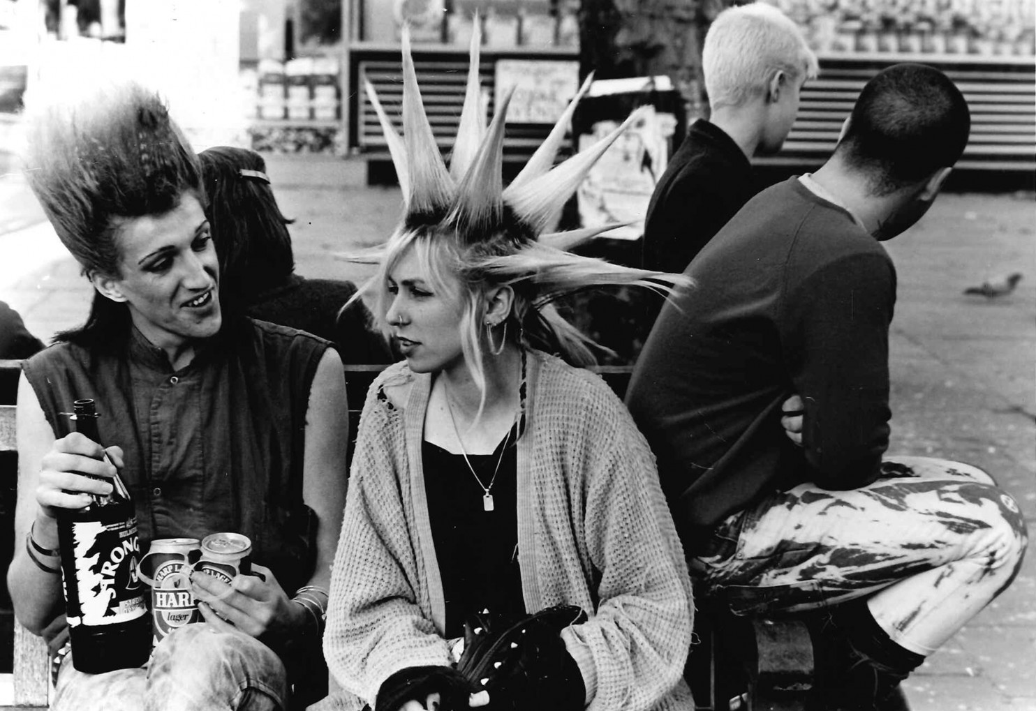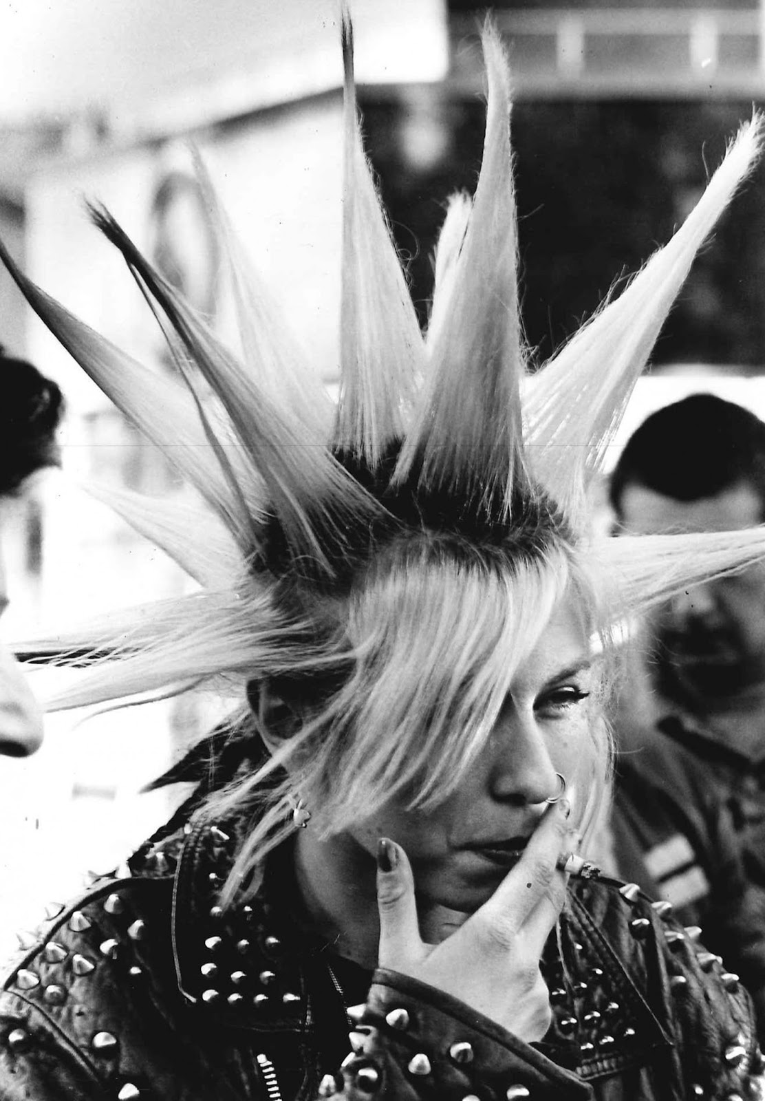 Hair was perhaps the most dramatic canvas of all. Mohawks grew taller and more extreme than anything seen in the 1970s, often bleached white or dyed in vivid, unnatural colors.